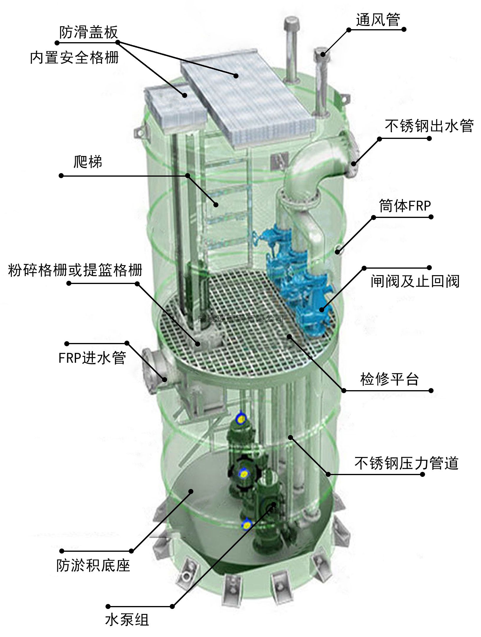 预制泵站是解决无自流条件下的污水、工业废水、雨水、饮用水、灌溉等水资源调配问题的动力来源。泵站主体由耐腐蚀的高强度玻璃钢筒体、专用水泵、截污设备、检修平台、管道、阀门、液位传感器、控制或智能远程化控制系统设备、废气检测、废气处理和通风设备等部件组成。